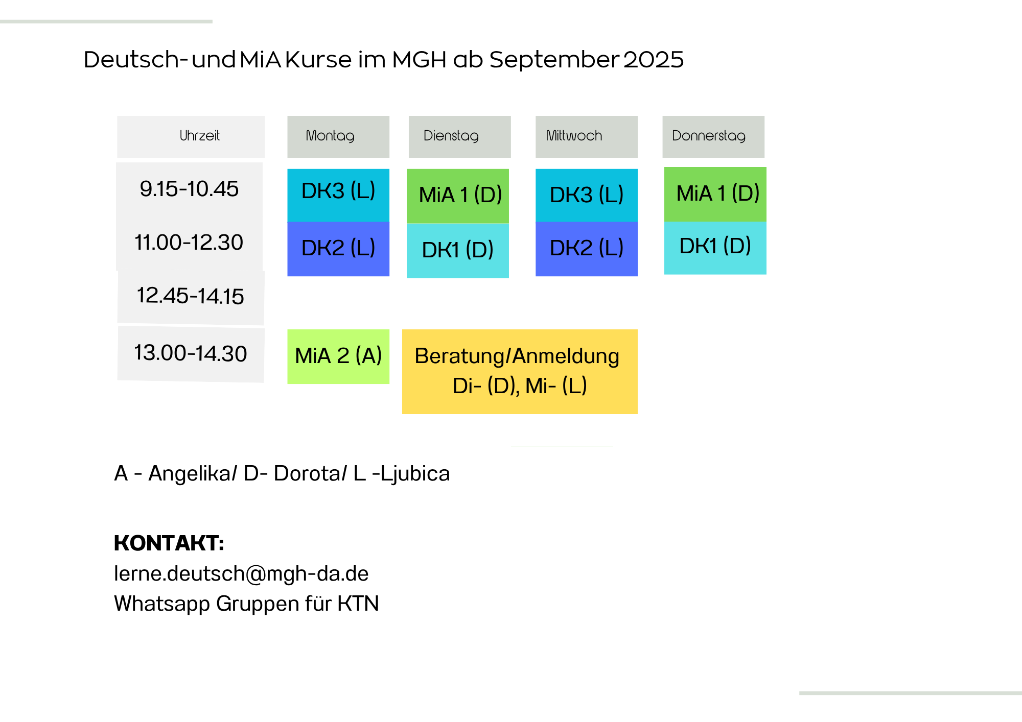 In unseren Sprachkursen sind alle Erwachsenen willkommen, die kein bzw. nur ein wenig Deutsch sprechen, möchten aber aktiv am Leben in Darmstadt teilnehmen und mehr Sicherheit im Alltag gewinnen. Wir bieten den Anfänger:innen einen leichten Einstieg in die deutsche Sprache, Grundkenntnisse in Sprechen, Lesen, Schreiben und Verstehen.
